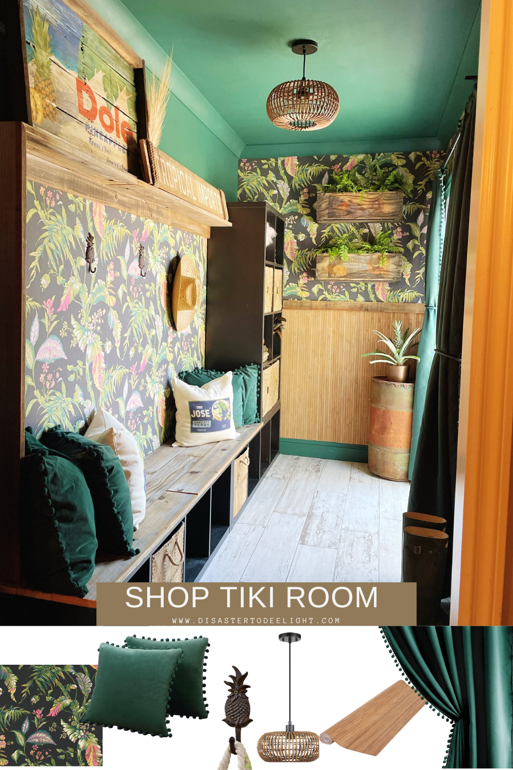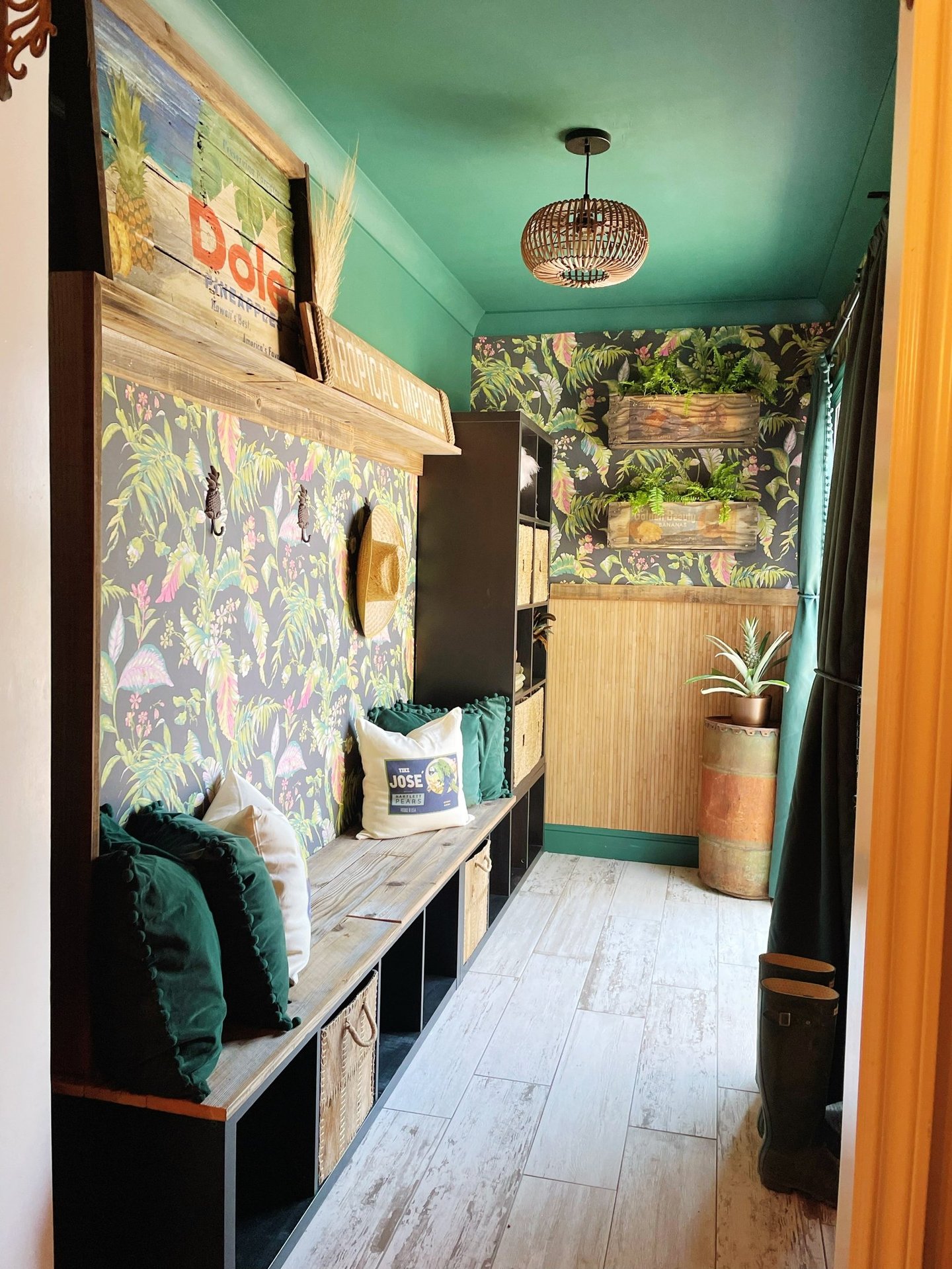 To bring in some Disney magic, I pulled details directly from the rides. The pillows and artwork feature the names of the famous Tiki Room birds, while a hand-painted “Tropical Imports” sign nods to the one above the Jungle Cruise queue. Of course, I couldn’t resist including a tribute to the famous Dole Whip, so I created a hand-painted Dole sign for the space. The bench and cubbies started as basic IKEA pieces, but I added reclaimed wood for a rustic, weathered feel that fit the jungle theme perfectly.
