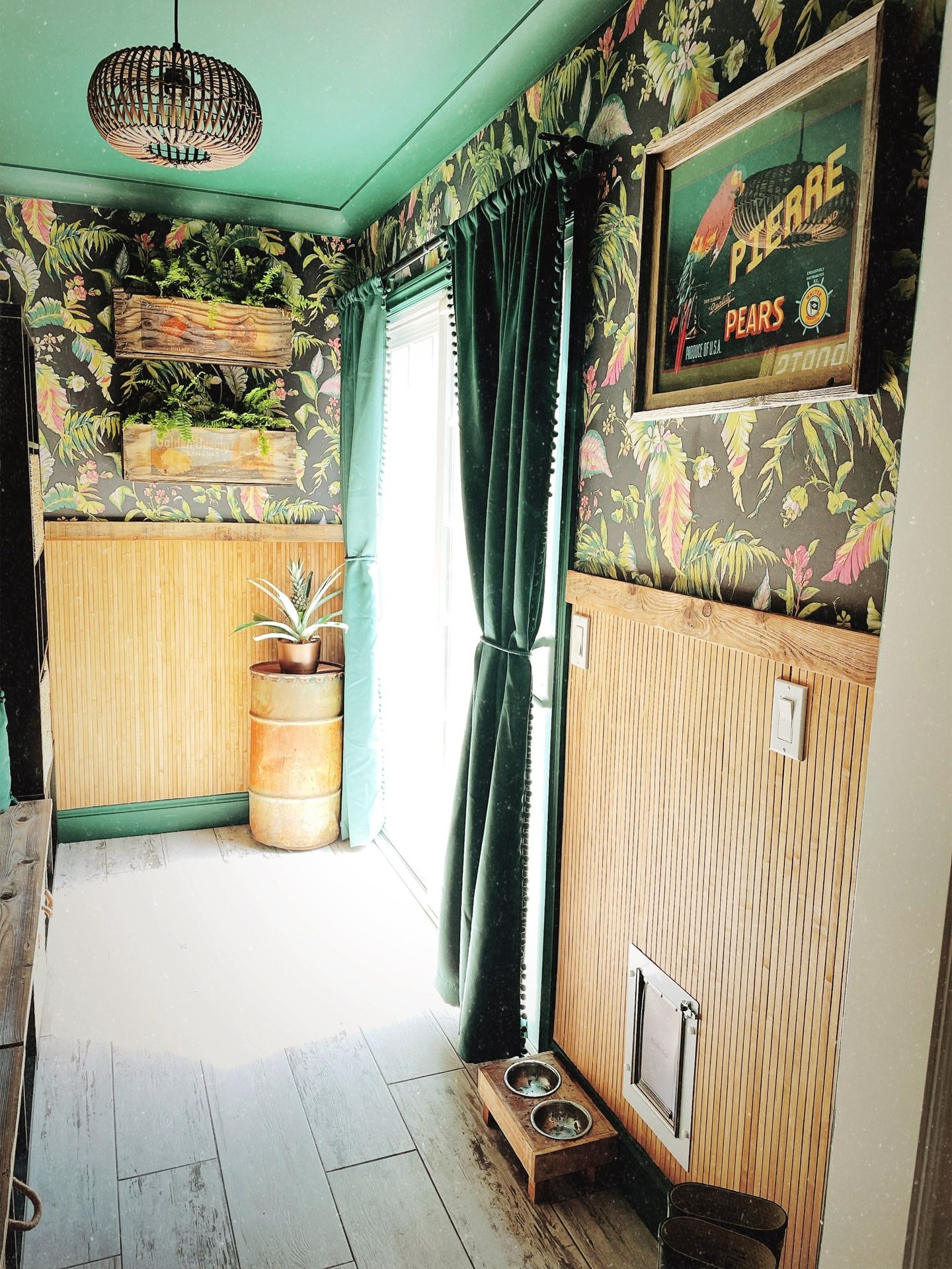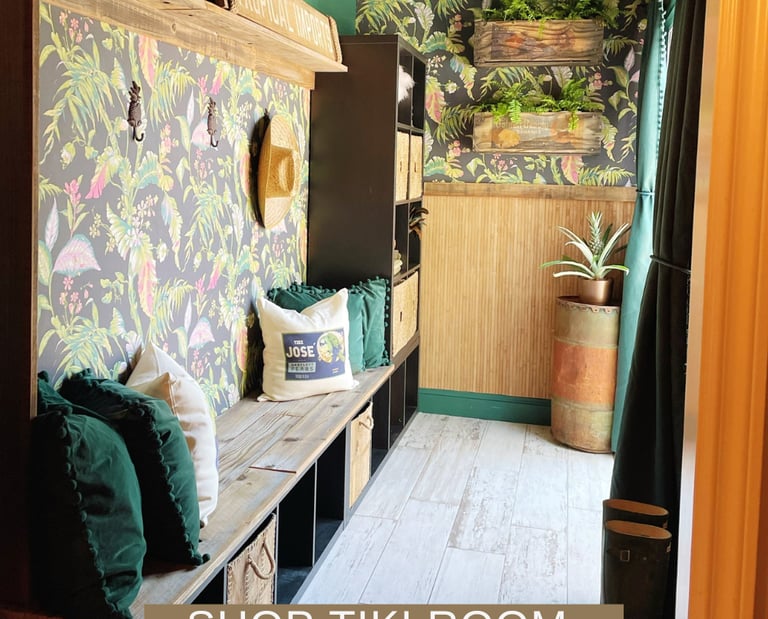 When I first set out to transform this space into a mudroom/catroom, my inspiration came straight from two of my favorite Disneyland attractions: the Enchanted Tiki Room and the Jungle Cruise. I wanted it to feel playful, lush, and just a little bit adventurous—like stepping into a tropical hideaway right out of Adventureland. The funny thing is, when the wallpaper and vibrant colors first arrived, I hated them. They weren’t my usual go-to (black everything), and returning them wasn’t an option. So, I decided to fully embrace the tropical chaos—and I’m so glad I did.