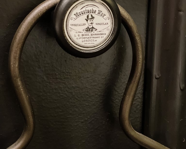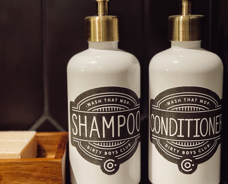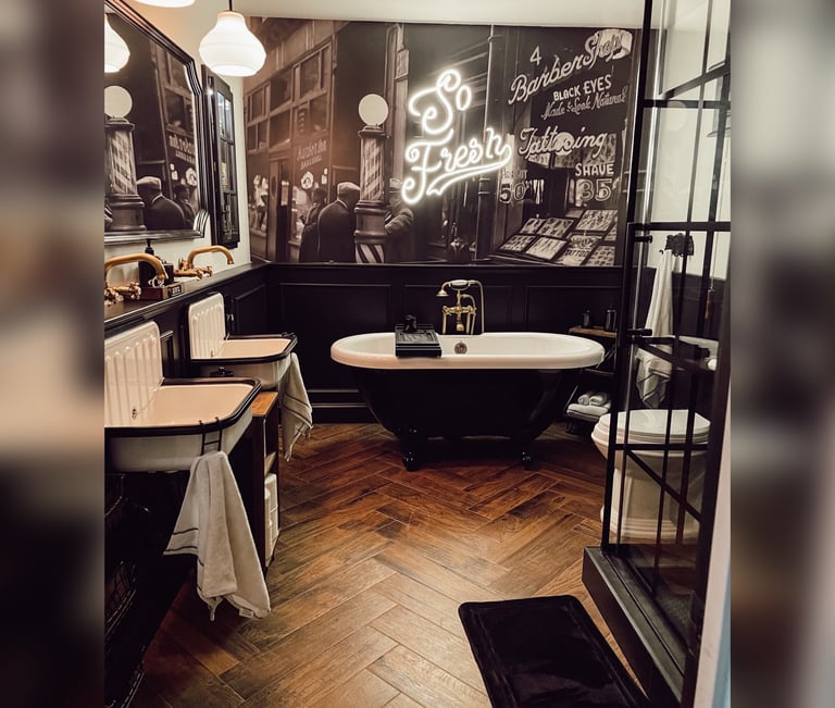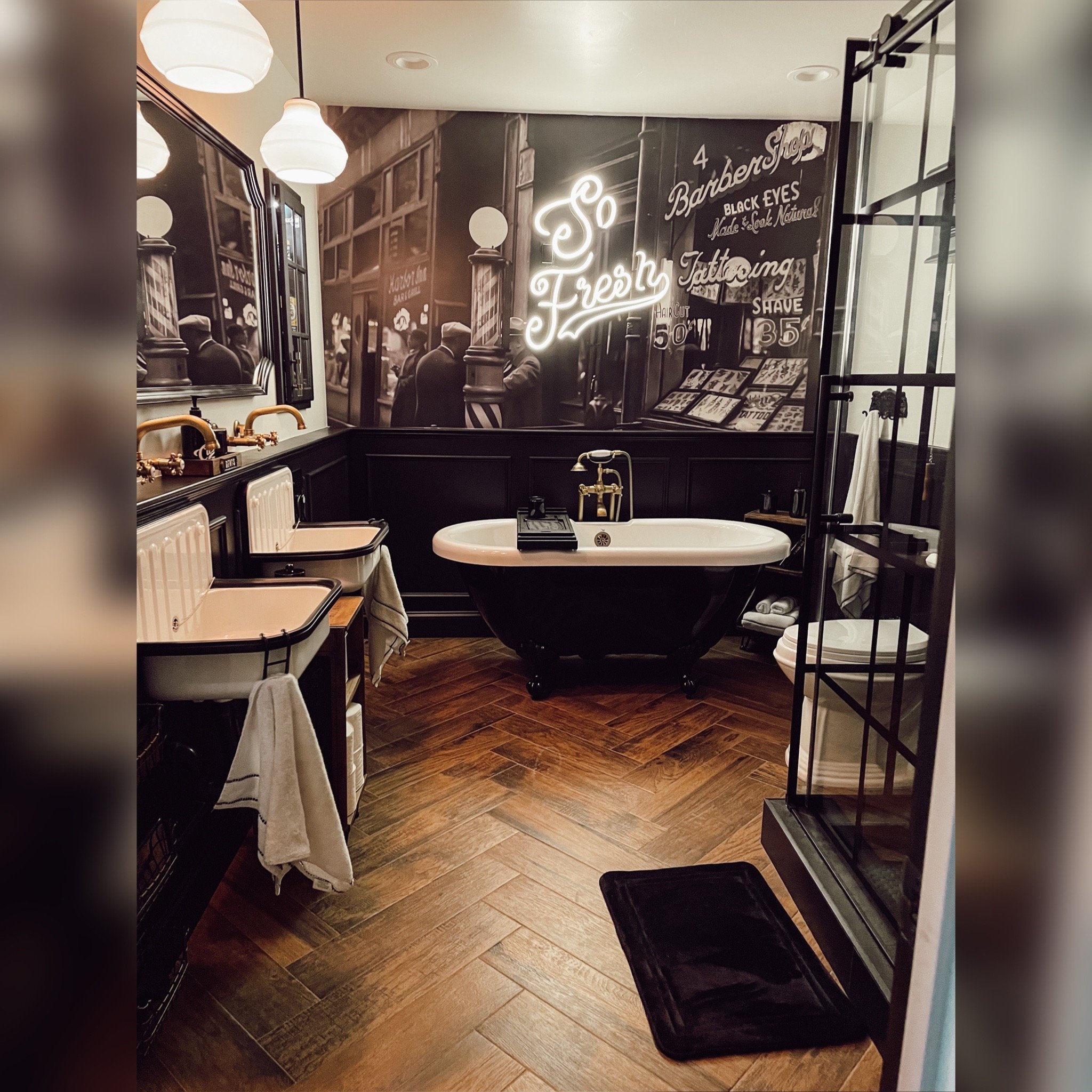 The black paneling, classic tile, and moody tones gave it that timeless look, but what really pulled it together were the little touches—like the handmade neon “So Fresh” sign, vintage hardware, high tank pull chain toilet, and those custom labels that feel like they came straight off a backroom shelf in a 1940s apothecary. The sinks were chosen to feel like old washbasins you’d find in a downtown barbershop, and the floors give off that warm woodgrain that balances out all the black. I built a cubby with a Crate55 vintage-inspired crate turned storage unit. it’s both useful and fits the theme.