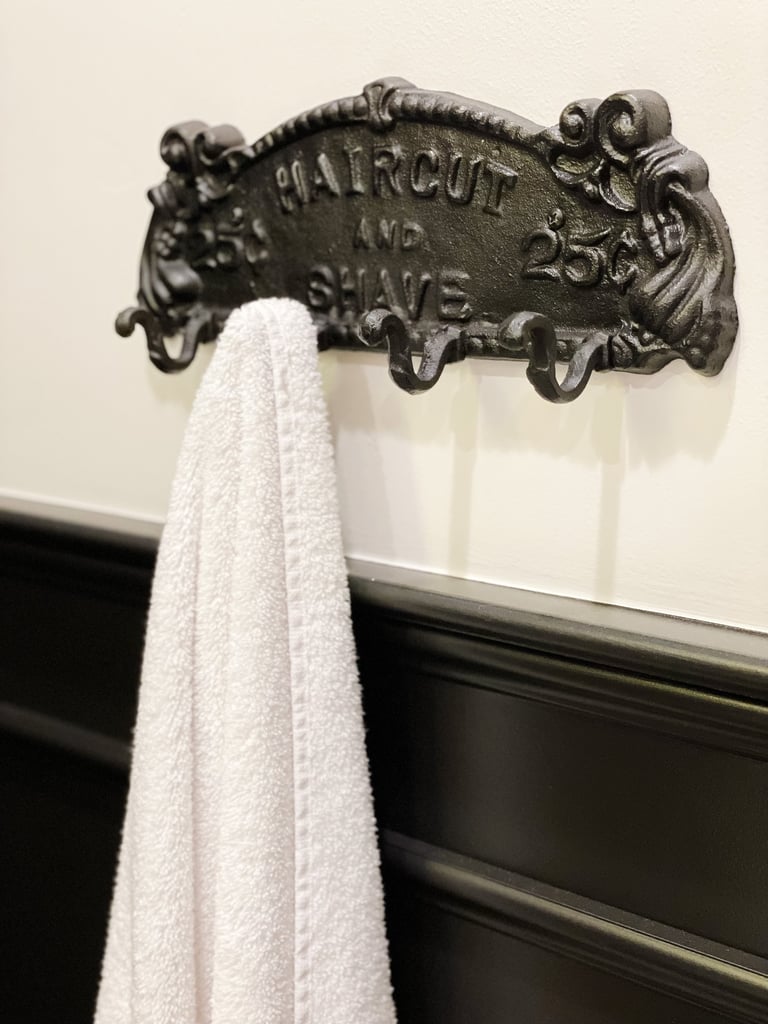 This bathroom makeover might be my favorite room in the house. I went for a vintage 1940s barbershop one where you would see pinstripe suits, hot shaves, and big band music playing on a crackly radio. It’s the boys’ hall bath, so I wanted something with old school charm but still totally functional and a little funny.