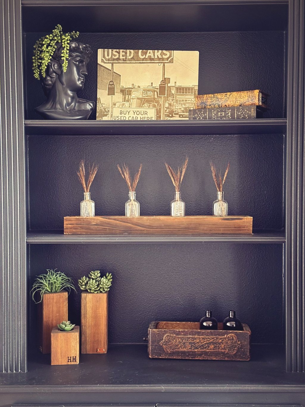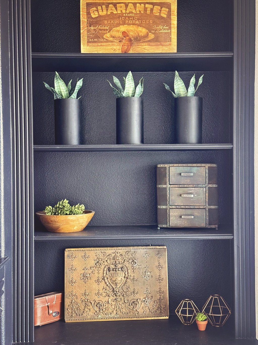 This room was sterile feeling. Like a cold outdated doctors office. All white, no warmth, and definitely no personality. Until now. I decided to paint everything black (because obviously) and it completely changed the mood of the space. It instantly felt moody and cozy in the best way. The fireplace got a little extra love with a DIY painted tile makeover that took it from outdated to swoon, and I finally had a place to pull together some of my favorite thrifted and swap meet finds and a little handcrafted love.