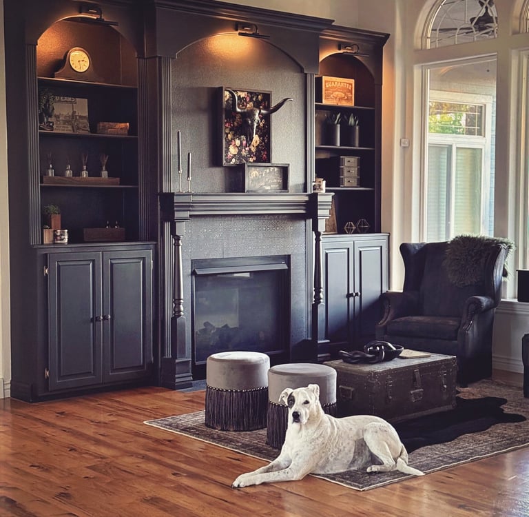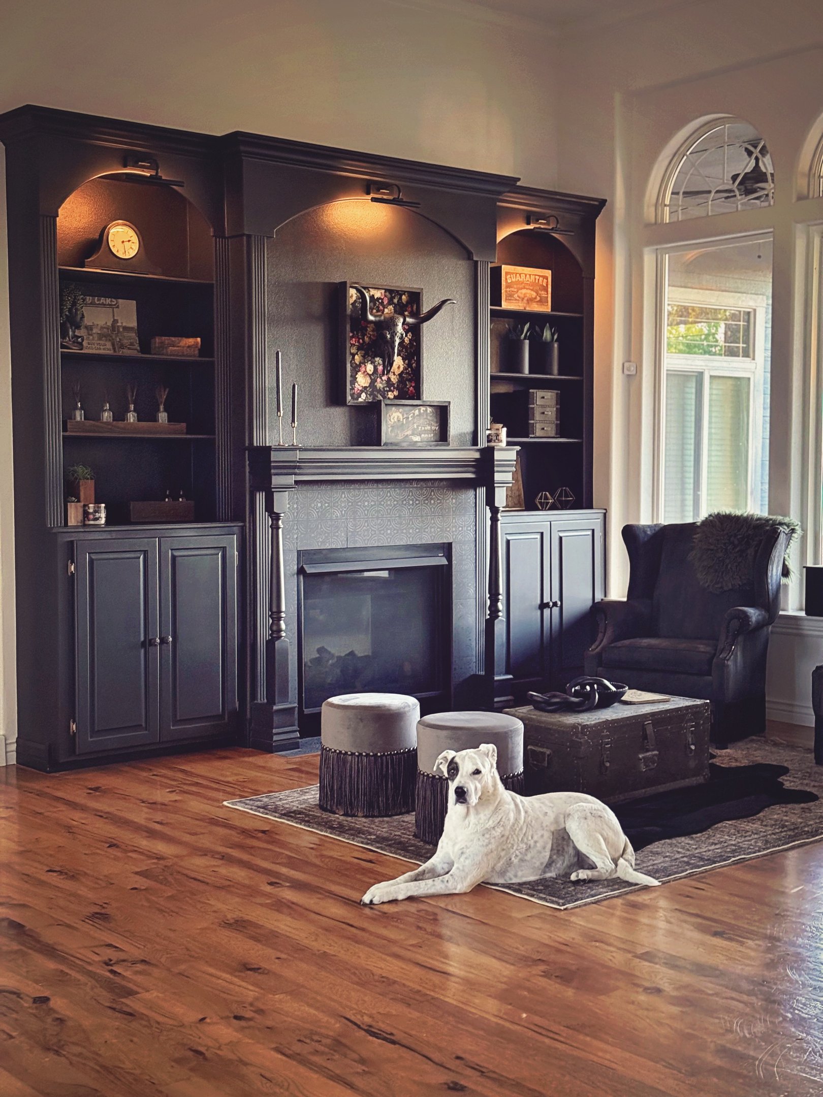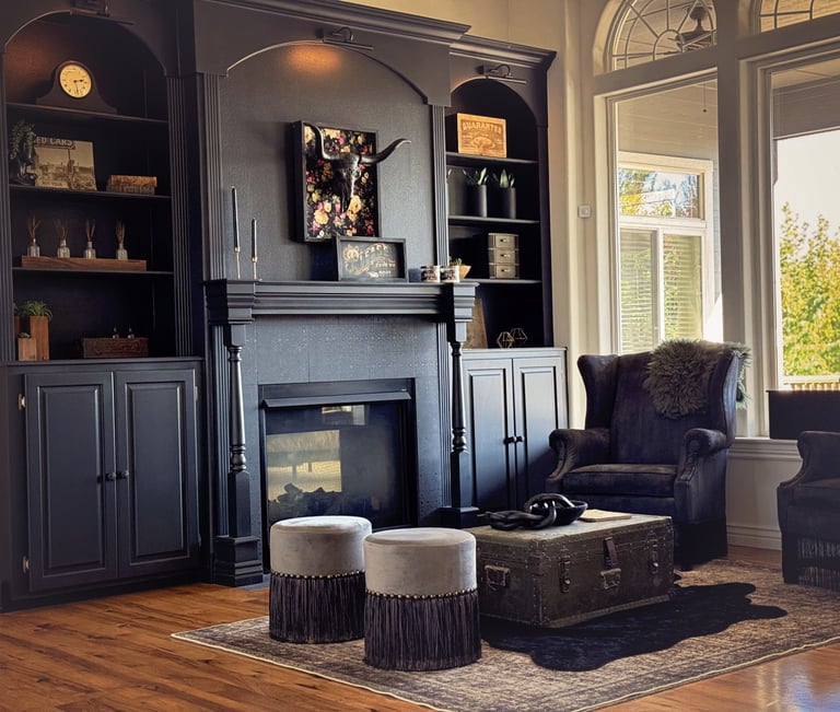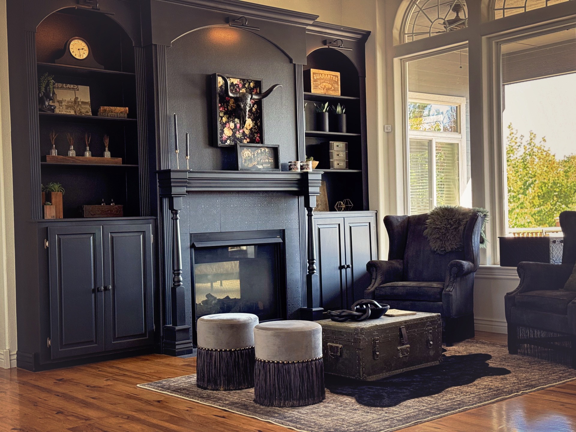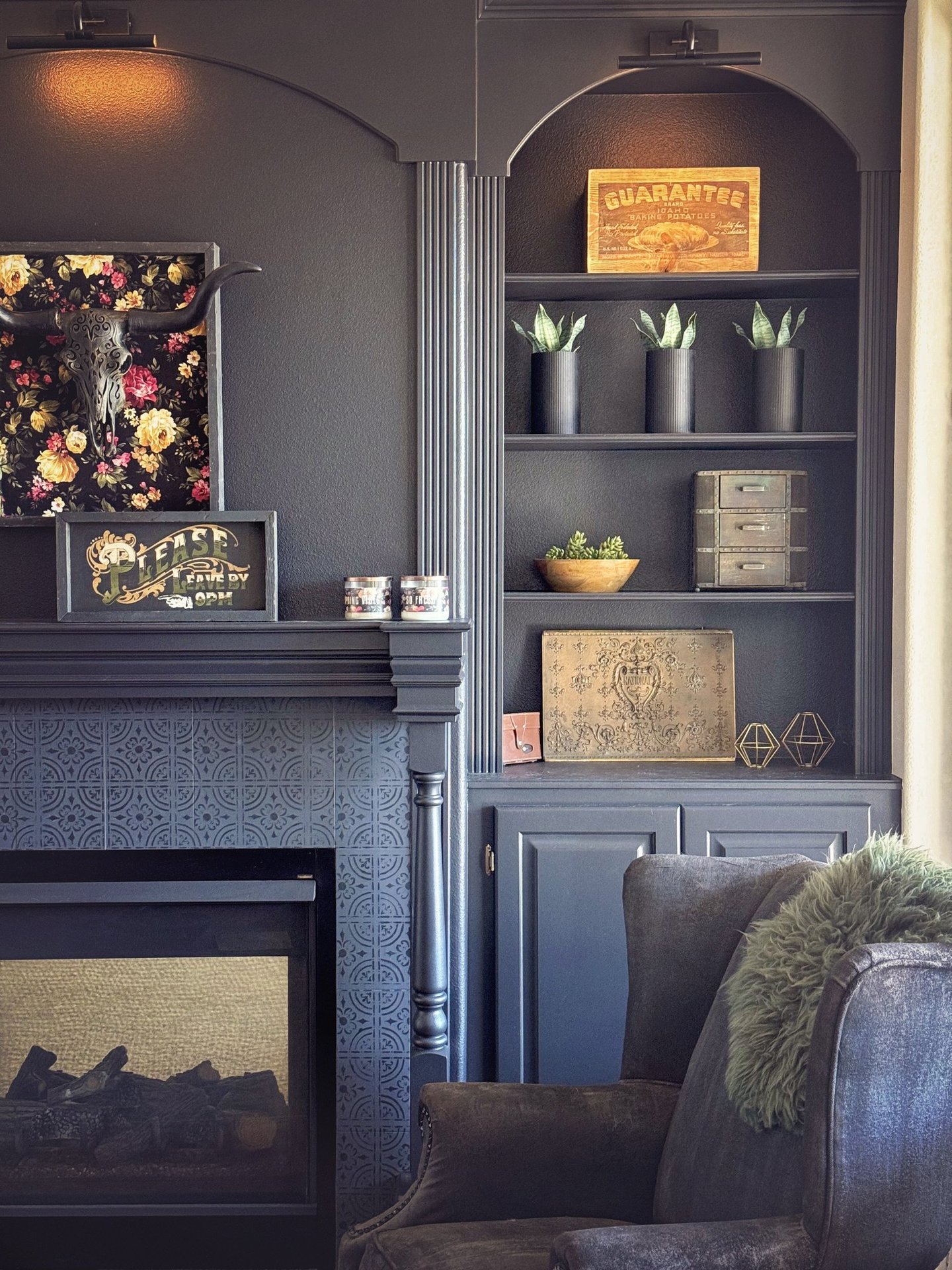 It’s definitely not a traditional living room anymore and that’s kind of the point. Between the dark walls, cozy lighting, and texture everywhere, it now feels like the perfect spot to curl up, read, or sip something strong and moody