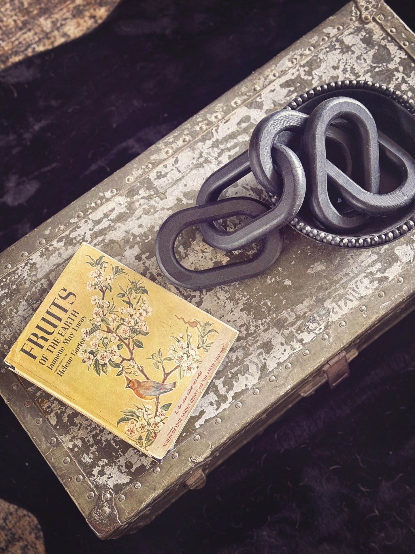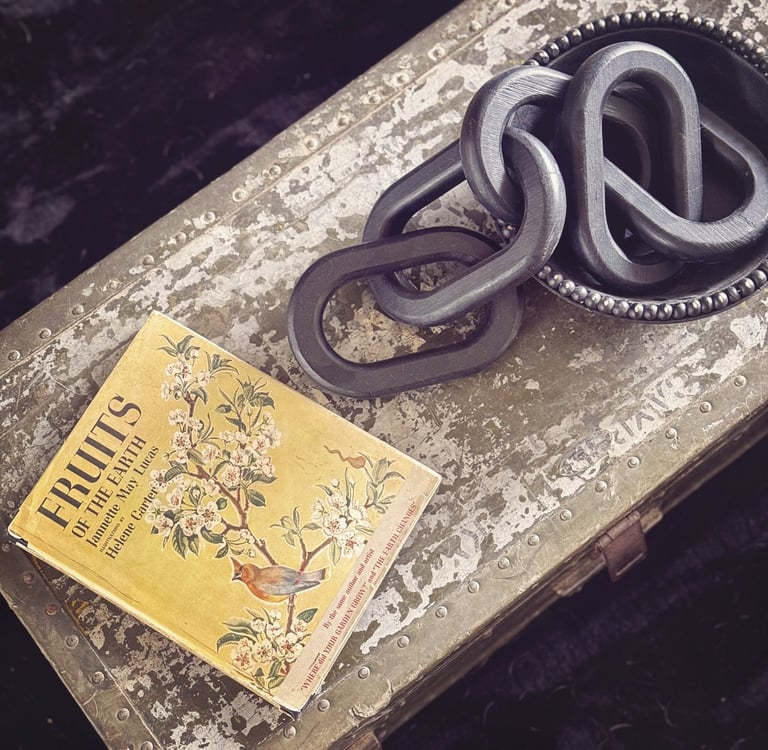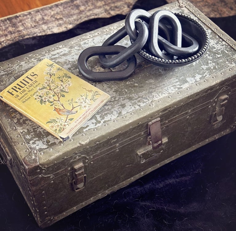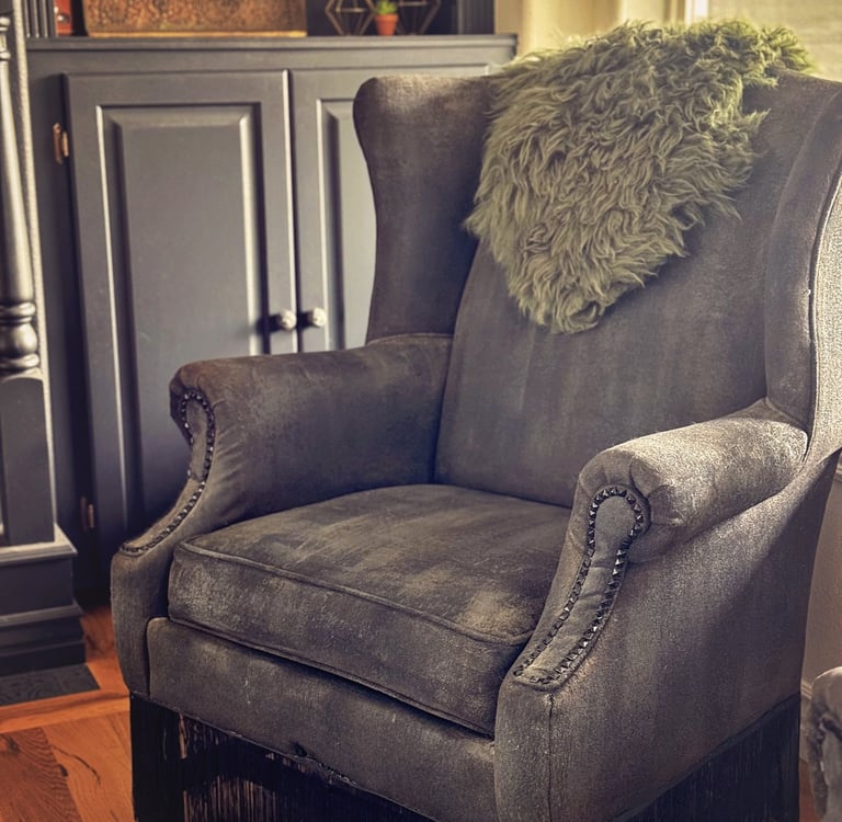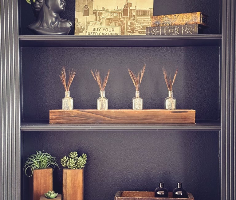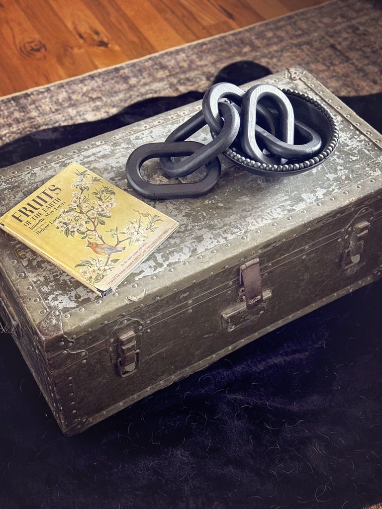 The whole goal was to give it some soul. I didn’t want it to feel like a brand new waiting room. I wanted it to feel like something layered, curated, and lived in. A couple of vintage signs (including a very necessary "please leave by 9 one), an old trunk turned coffee table, and a moody floral skull art piece pulled everything together. I even gave my old salon chairs a little fringe-trimmed makeover to help them feel like they belonged in their new surroundings.